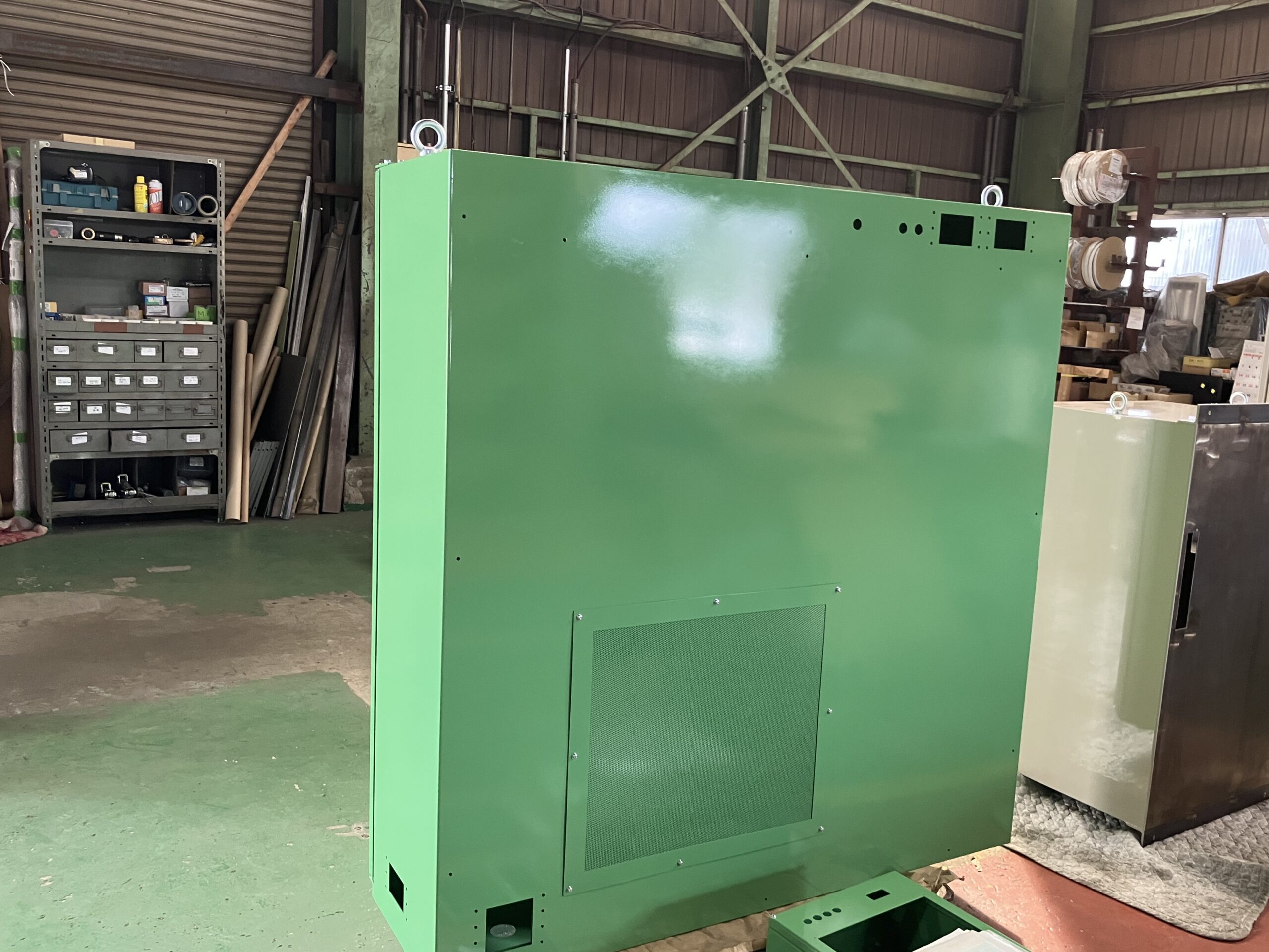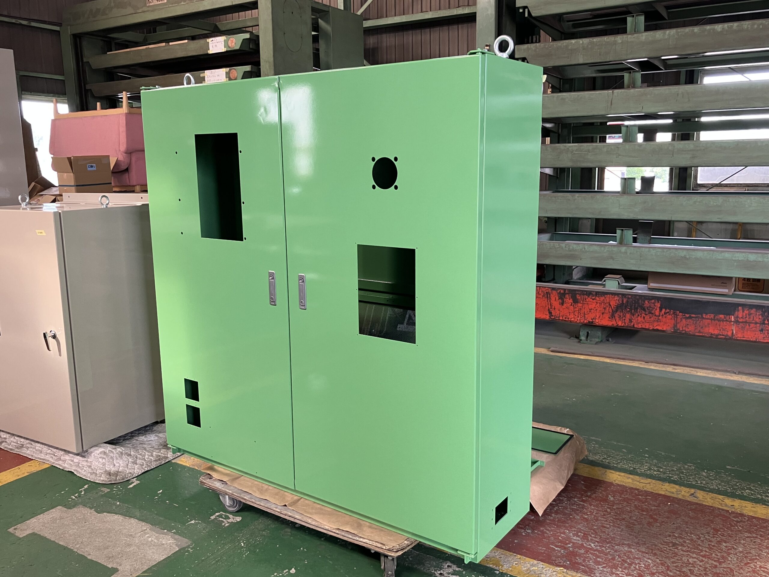 さらに、内部には様々な機器を取り付けられるよう部材を多数用意し、効率よく設置できるような加工ポイントを残すなど、機能性を追求した設計が施されています。最終的な塗装も、納品先の工作機械マシンに合わせた色で仕上げるなど、細部にわたるオーダーメイド対応力を持っています。